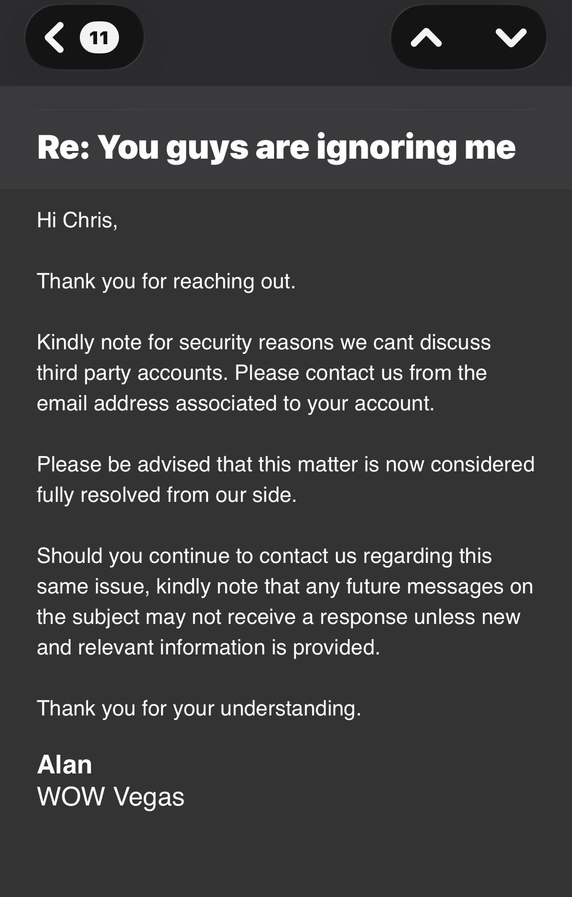 “Wow Vegas” I wait patiently for you to address my issue.