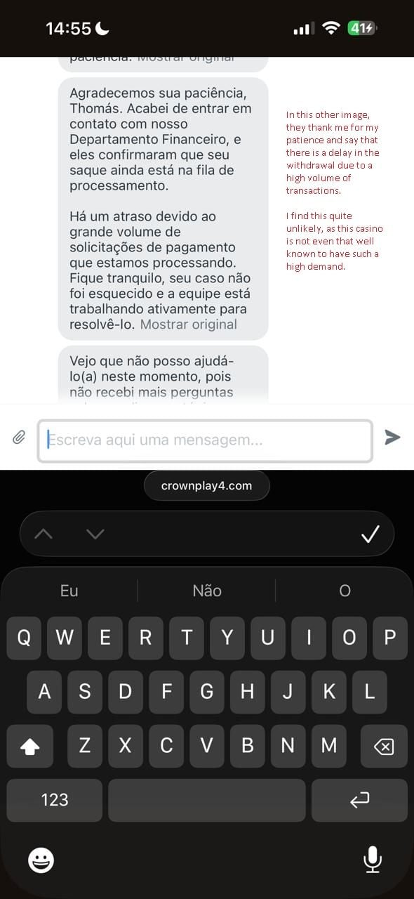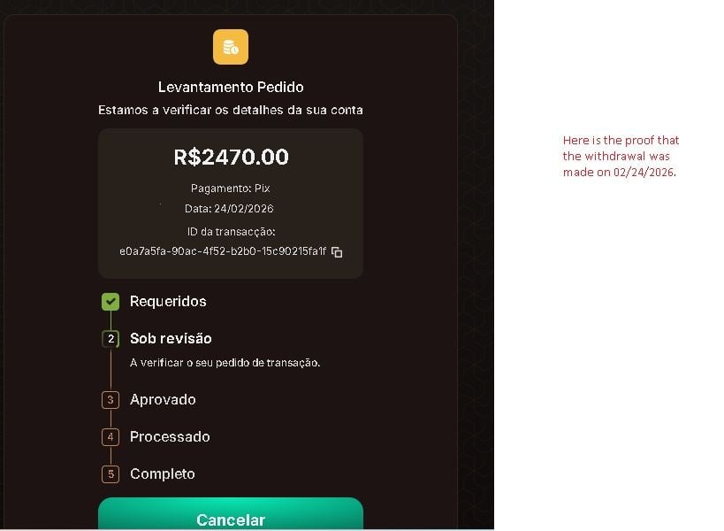 I made a withdrawal in the amount of 2,470 reais on 02/24/26; however, to this day, the money has still not been credited to my account. I contacted customer support several times and received the same excuse every time. This time, however, I took screenshots and am posting them here so you can draw your own conclusions.