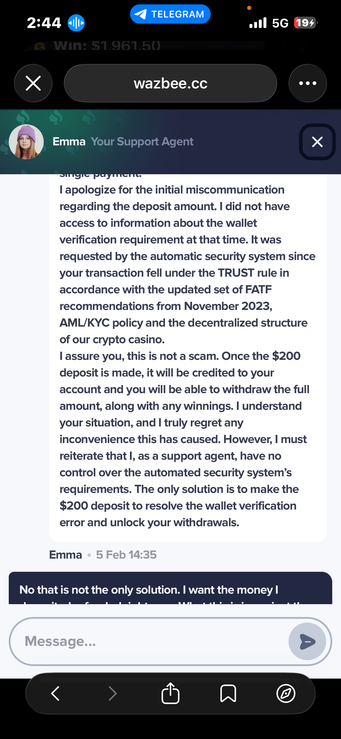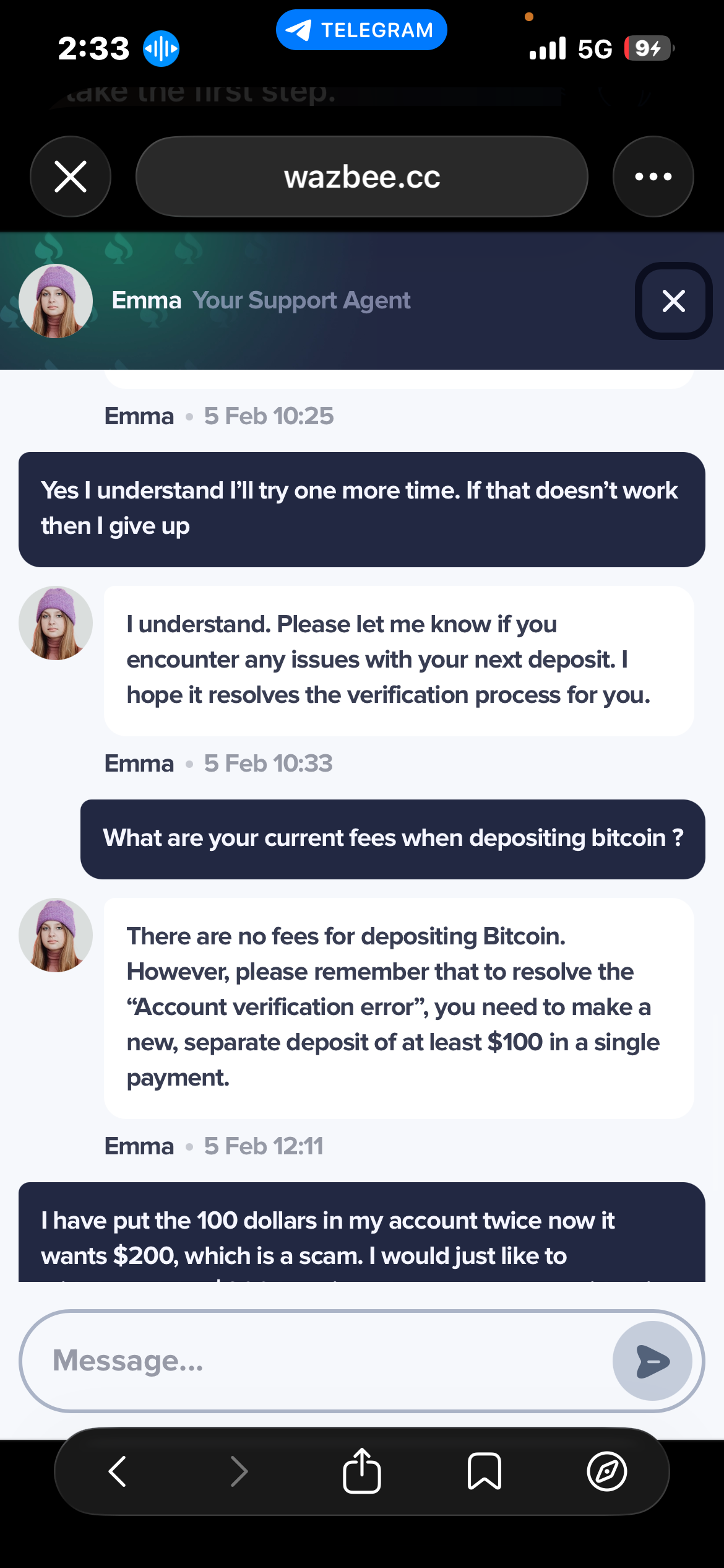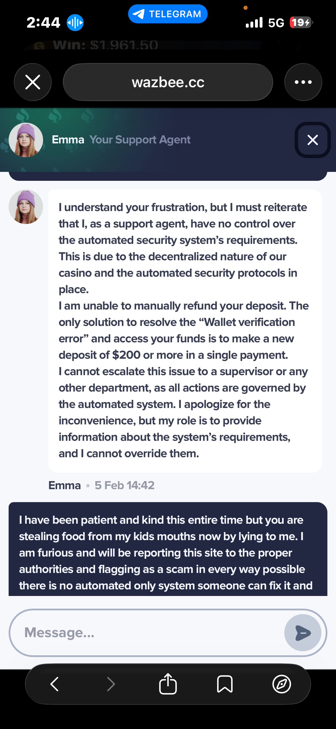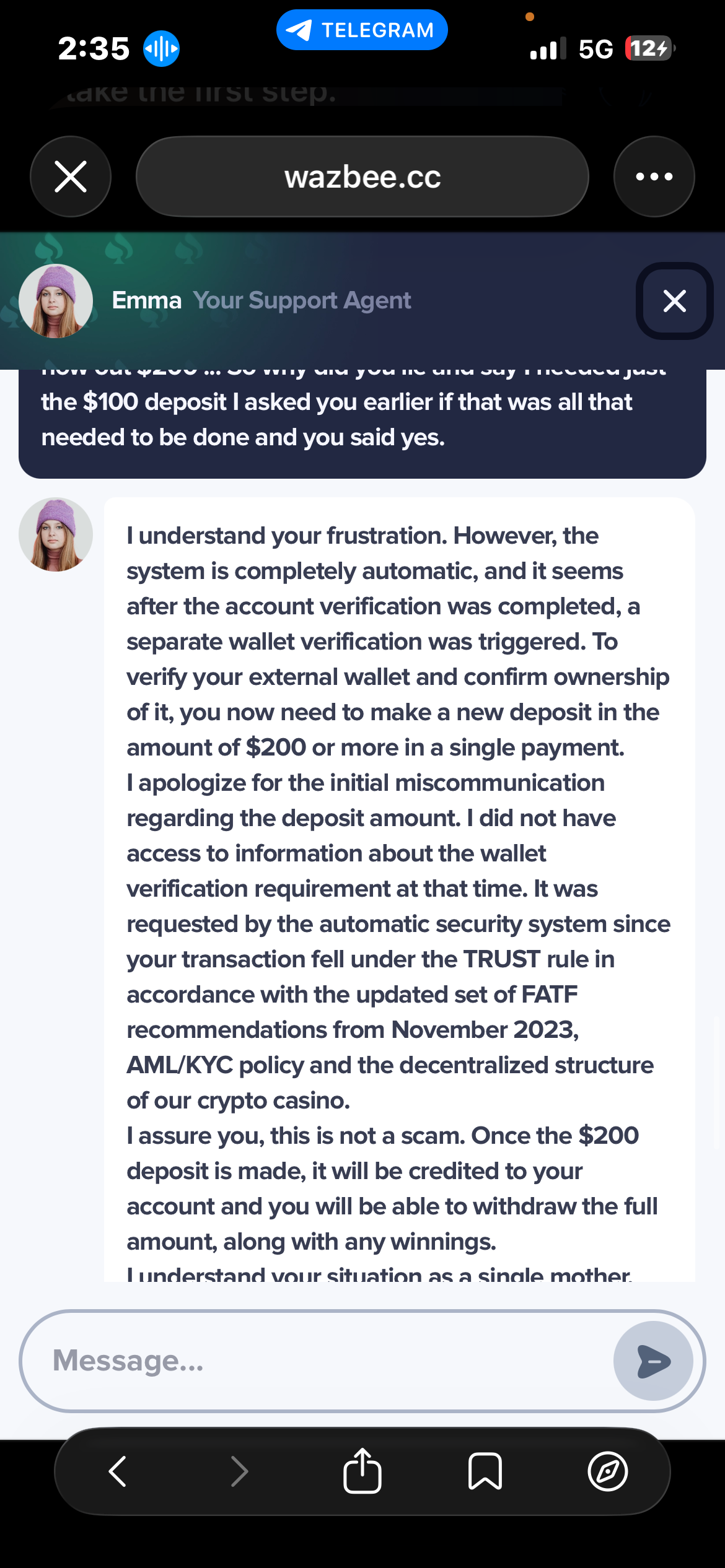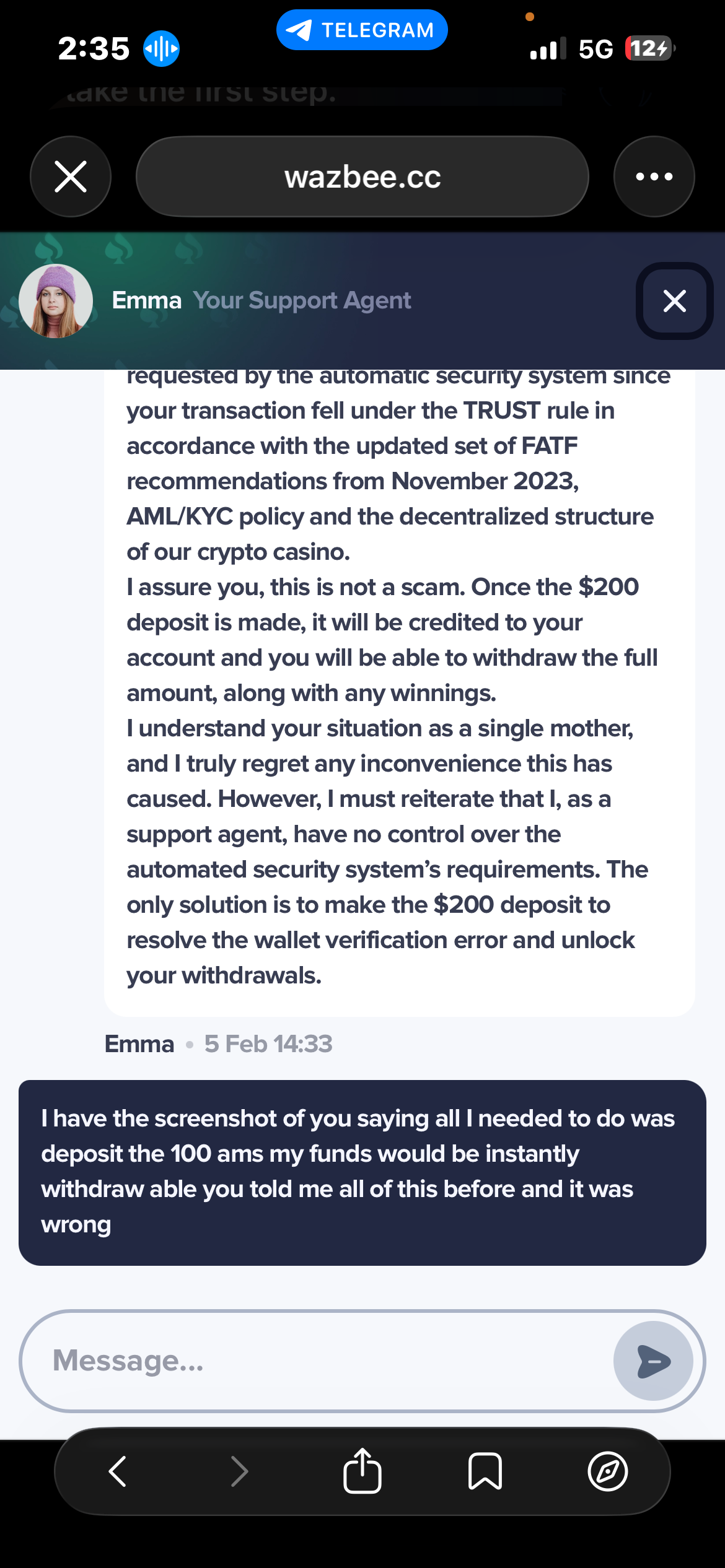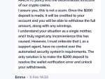 I made an account, hit BIG. Went to verify myself, and they asked for a one time $100 deposit and I was “guaranteed instant withdrawal” right after. The “customer service” kept saying just make the deposit etc all is fine you can withdrawal right after”. So I deposited $100 but with their crypto fees it came out to $98 and some change. So I spent my last $116 to deposit again…. Then it tells me I need to deposit $200 now and thennn I can withdrawal. I’ve for screenshots of it all. I said okay I don’t have more money so just let me withdrawal what I’ve deposited… she said she couldn’t refund me or drove the verification request then LITERALLY in the middle of me typing my account is deleted. With my two deposits. Gone. Go to sign back in and it says no account exists. I am a single mom and they robbed me of my last $200+ dollars! They need to be criminally charged-NO ONE use them!!!