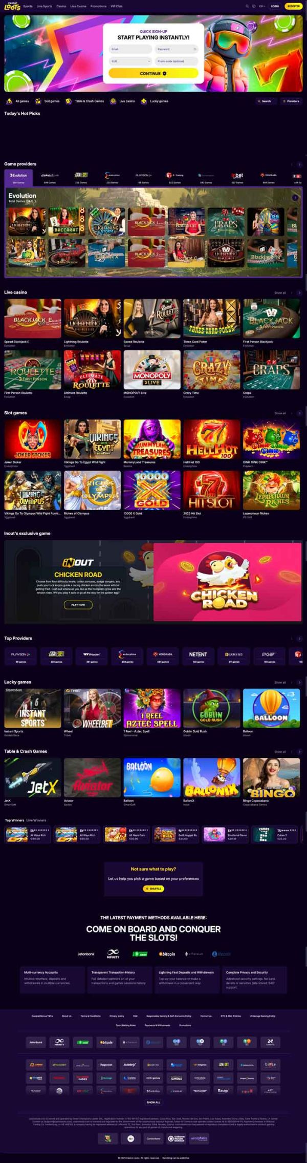 Das Casinoloots Casino ist ein Online Casino, das vom Anjouan Gaming Board reguliert wird. Die Plattform vereint Casino Spiele mit einem Sportwettenbereich und deckt flexible Zahlungsmöglichkeiten ab.