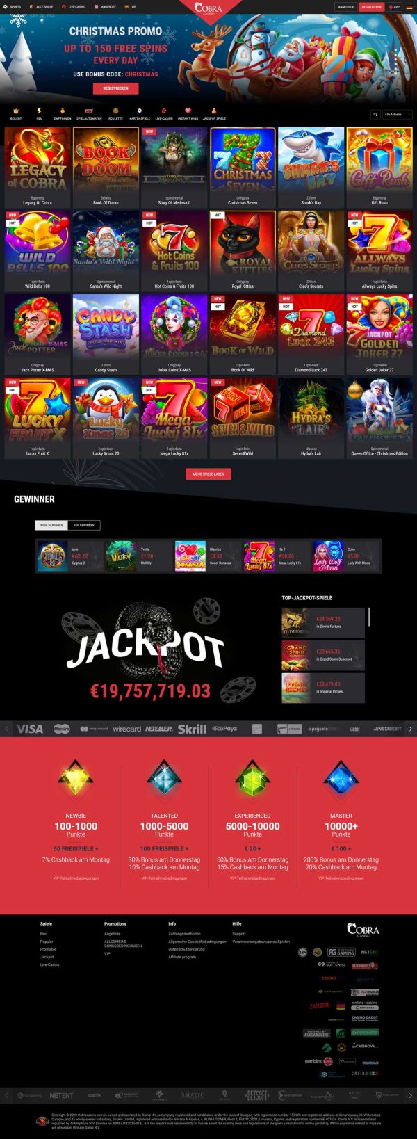 Auszahlung funktionierte auch tadellos.Und sehr viele Slots Anbieter alle soo bekannten Privider wie z.b PlayNGo Pragmatic Pushgaming Netent usw. Sehr empfelenswert Cobra Casino immer wieder gerne. TOP