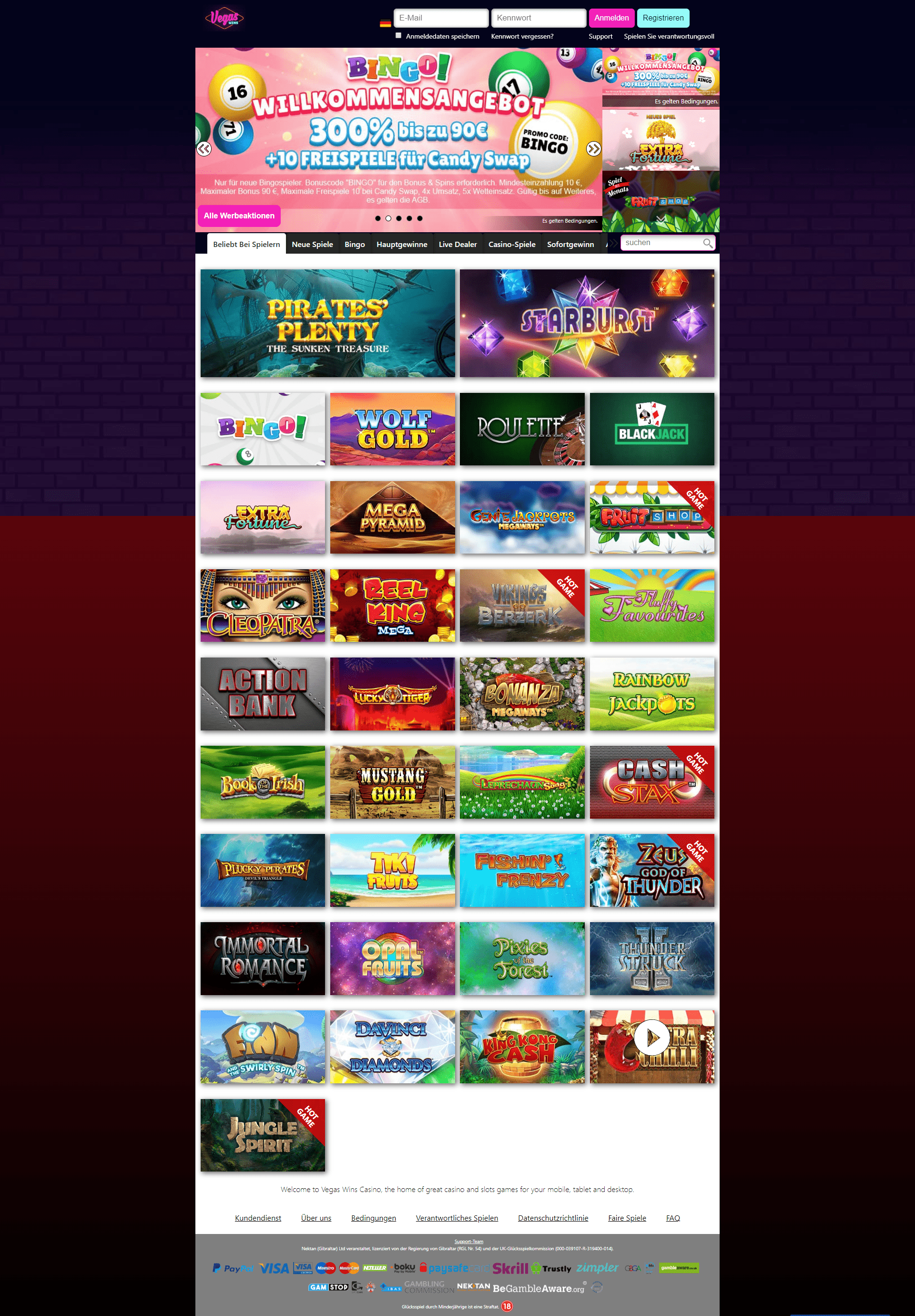 VegasWins Spielothek ist eine vertrauenswürdige Online Spielothek mit mehreren Glücksspiellizenzen, die Echtgeld Spielern maßgeschneiderte Spielothekunterhaltung bietet. Online Spielautomaten und andere hochwertige Spielothekspiele von lizenzierten Software-Giganten wie u. a. NetEnt, Microgaming, Yggdrasil, Pragmatic Play, Evolution Gaming, Merkur Gaming und Big Time Gaming sind im VegasWins zu finden. Für unbesorgten und spannenden Spielspaß in der VegasWins Spielothek sorgt die Glücksspiellizenz von Gibraltar.