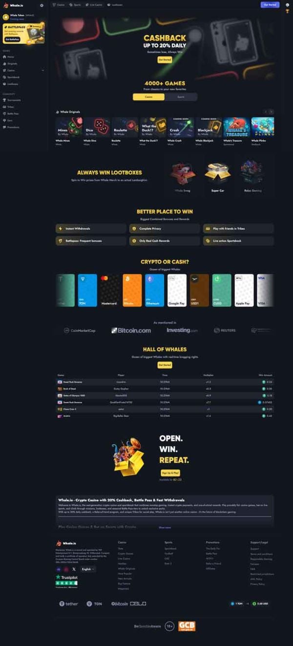 Es gibt keine gewöhnlichen Boni, sondern nur Belohnungen, die Sie durch das Spielen freischalten können. Dadurch erhalten Sie Whale Tokens, die Sie gegen einen höheren Cashback-Prozentsatz oder RTP eintauschen können. Alles in allem, würden wir dieses Casino mit einer Warnflagge versehen.