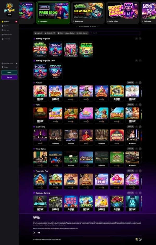 BetHog Casino te permite cambiar sin problemas entre categorías de juegos de casino usando cualquier dispositivo, incluidos los últimos teléfonos móviles. El casino ofrece una buena variedad de juegos en su vestíbulo fácil de usar. Su mascota se parece mucho a Bebop de Tortugas Ninja, así que si eres un fan, tu experiencia de juego será todavía más divertida.