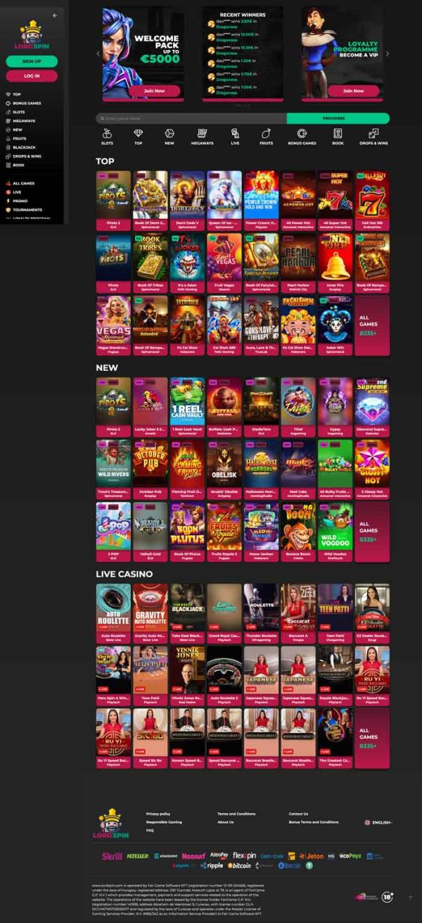 Lordspin casino online ofrece un extraordinario catálogo de juegos. Con más de 9,000 títulos disponibles, incluyendo tragamonedas, juegos de mesa y casino en vivo, los jugadores está en presencia de uno de los mejores casinos online en términos de variedad y calidad de juegos.