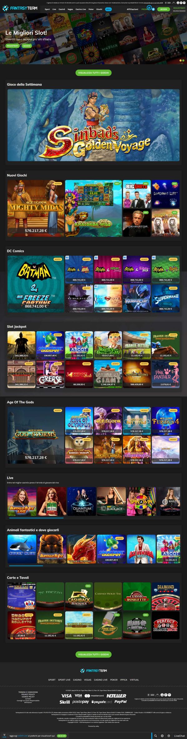 La pagina principale del casinò FANTASYTEAM mostra in primis la sezione dedicata alle scommesse, mentre gli altri giochi sono raggiungibili tramite seguenti voci del menu: Casinò, Vegas, Casino Live, Poker e Giochi (di carte).