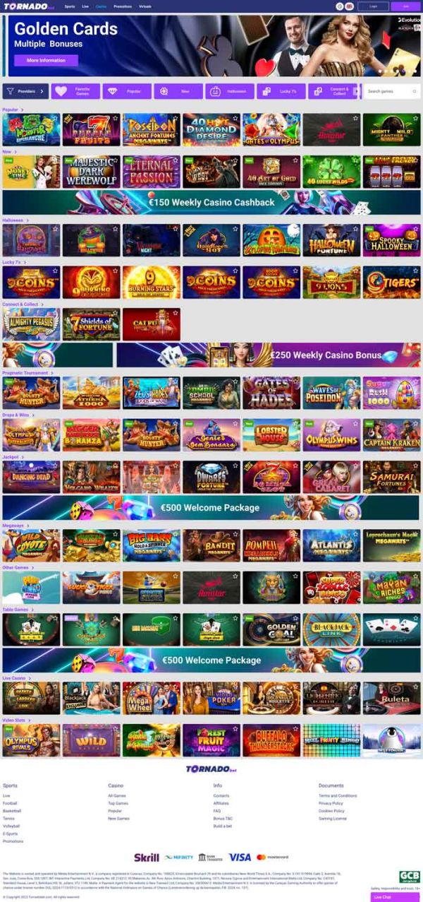 TornadoBet Casinoは、数十社の大手ソフトウェア会社と提携し、様々なカジノゲーム、ライブカジノゲームを提供しています。また当カジノサイトは、スポーツブックにも力を入れており、スポーツブック好きの方は非常に楽しめるカジノサイトだと思います。スポーツベットにもウェルカムボーナスが用意されているため、これまでスポーツベットをやっていなかった方も、ボーナスを活用してぜひプレイしてみてくださいね。