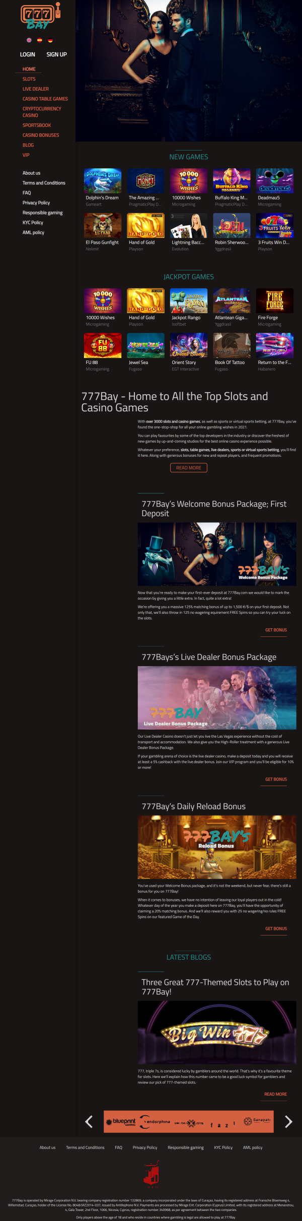 777bay Casino is an online casino home to over 3000+ slots and games from some of the industry's top developers. Whatever their preference players can enjoy discovering the hottest new games whilst still enjoying the oldest classics. The casino is home to a number of very well known software providers which include Microgaming, Pragmatic Play, Playson, Nolimit City, GameArt and Merkur.