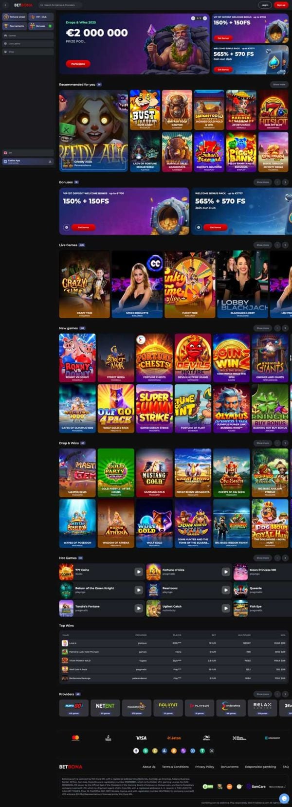 More than 40 providers power BetBona Casino, giving you a choice of around 9,000 casino games. To make browsing easier, games are pre-sorted into categories. You can jump straight into online slots, bonus-buy slots or jackpot slots with one click.