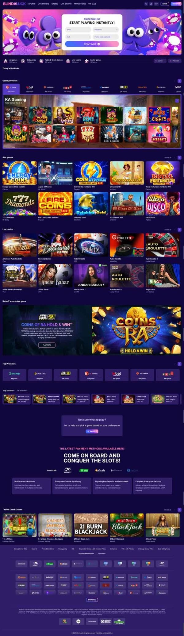 BlindLuck Casino impresses most with its huge game library. With dozens of software providers on board, including BetSoft, BGaming, Evoplay, Yggdrasil, and many others, players have access to thousands of games across multiple categories.