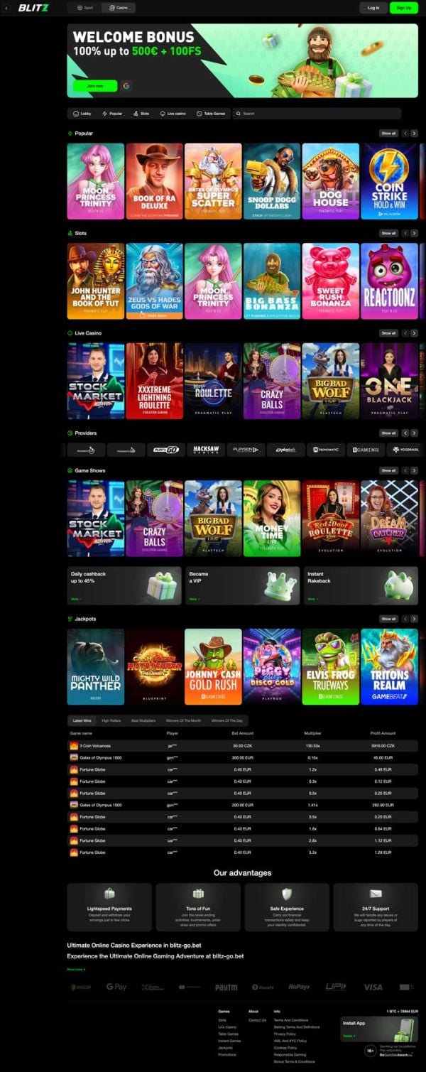 Blitz-go.bet Casino allows you to play the latest slots from various providers, while you can also enjoy live casino games. VIP club is open for special members, while you can also claim one of the bonuses upon registration.