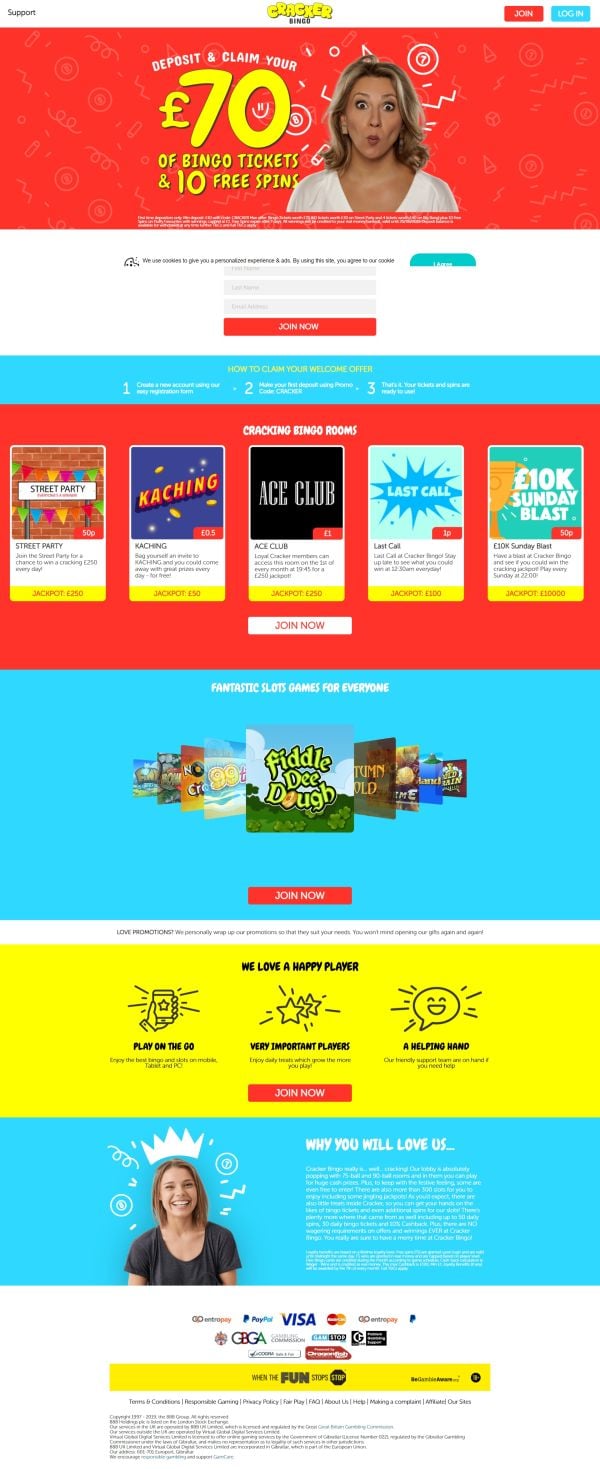CrackerBingo Casino is an online casino powered by Dragonfish and offers its players a catalogue of video slot games and bingo rooms. The casino is also home to a number of leading software providers which include NetEnt, Quickspin and IGT (WagerWorks). The site's primary language is in English and players can access it through a web browser or members can use their mobile casino. CrackerBingo Casino is licensed and regulated by the UK Gambling Commission and the Government of Gibraltar.