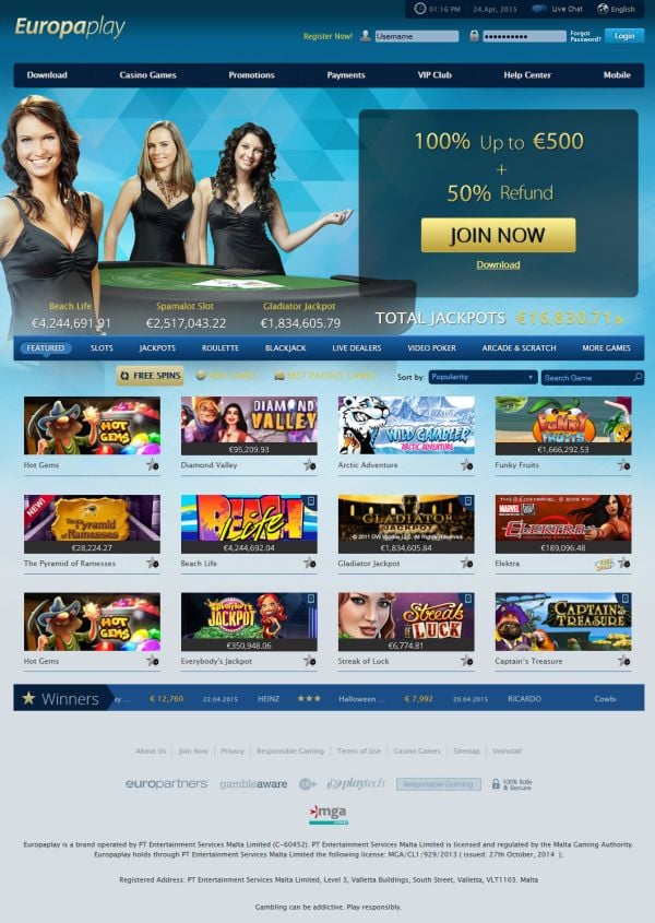 I joined at Europaplay Casino some months ago while I was looking for some decent online casino which offer games from Playtech software provider. I found this one and later I created my account with them. I like their website, it is designed pretty simple so you can find quickly what are you looking for.