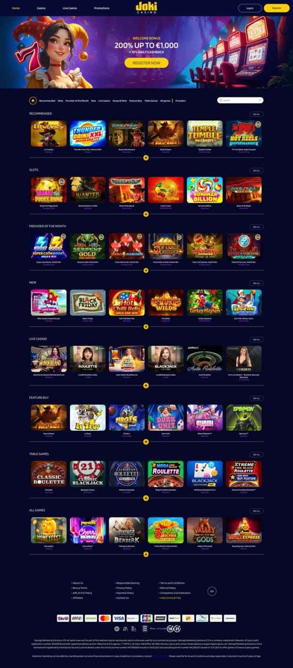 JokiCasino gives you access to the best providers! You can enjoy thousands of online slots, tables, live casino games and more. You can choose from a fantastic selection of payment methods to ensure online transactions. Support is always a click away once you create an account, but unfortunately, there is no live chat until you register. Finally, the casino is fully licensed and regulated by the Estonian Tax and Customs Board and the Kahnawake Gaming Commission.