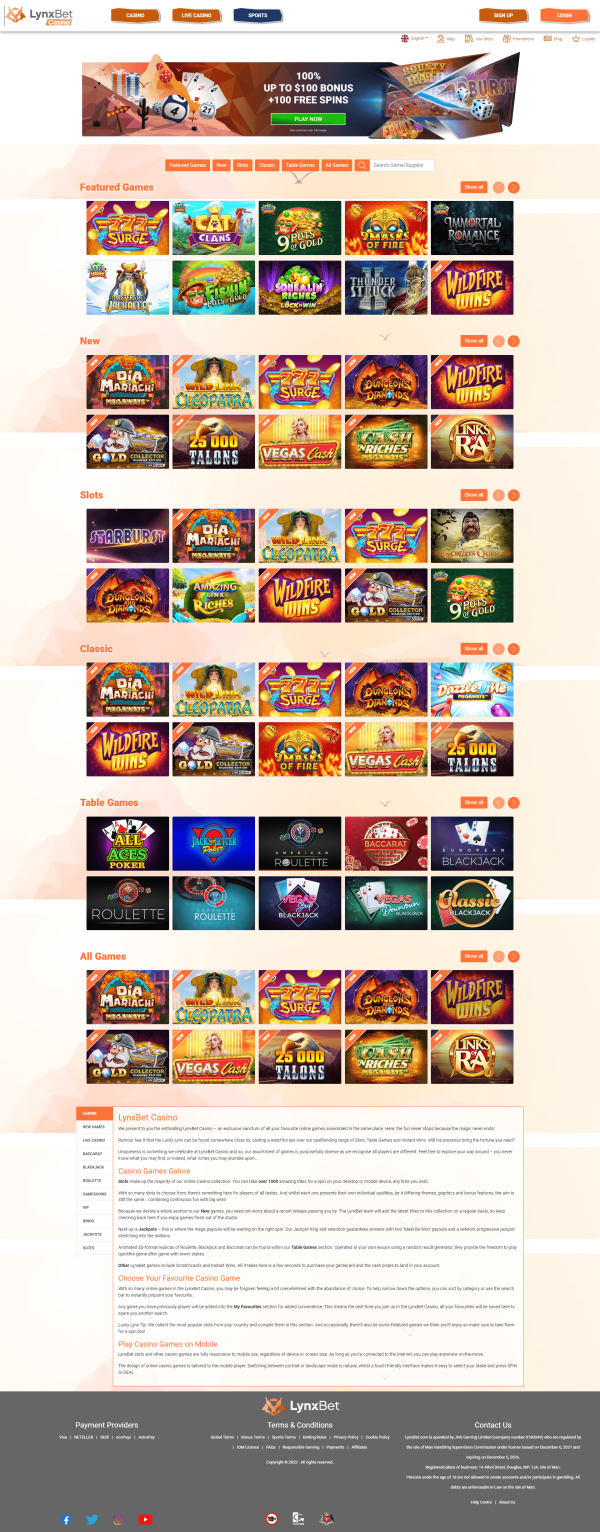 LynxBet Casino is an online casino offering casino games, sports, bingo and lottery games. The casino is also home to a variety of software providers including NetEnt, Play’n GO, Big Time Gaming and Pragmatic Play.