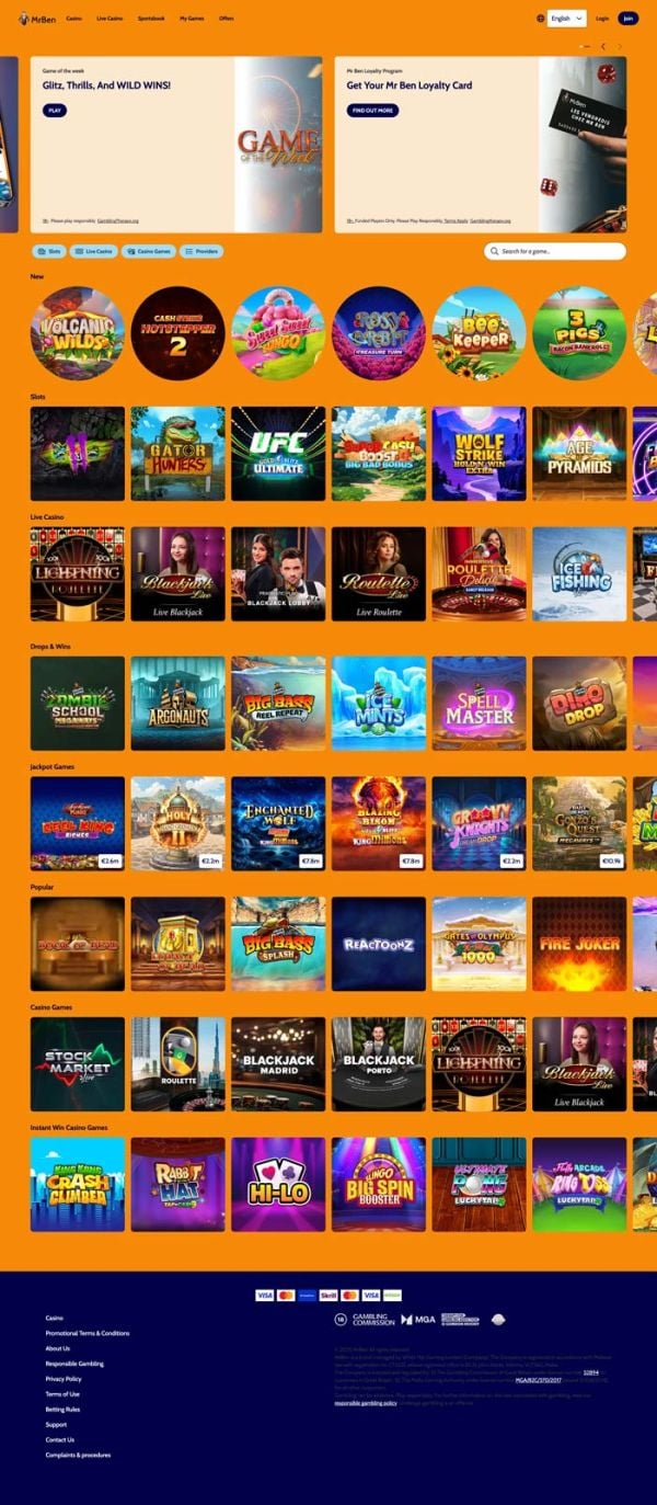MrBen Casino has a great selection of games available from well-known providers. You can try the latest online slots, tables, instant win games, live casino games or switch seamlessly to sports.