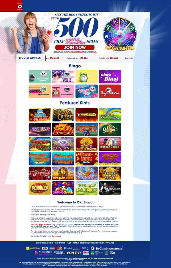 Ok Bingo Casino is an online casino operated by Jumpman Gaming Limited and home to an array of video slots, table games and bingo rooms. The site is primarily available in English and can be enjoyed instantly through a web browser or on the go. The casino also happens to be home to a number of top software providers that include NetEnt, Microgaming, Quickspin, Eyecon and others. Ok Bingo Casino is licensed and regulated by the UK Gambling Commission and the Alderney Gambling Control Commission.