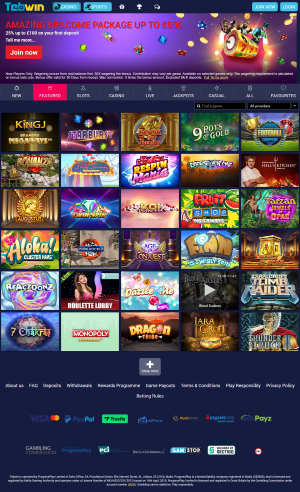 Tebwin Casino is an online casino where players will enjoy instant access to a large variety of games which include slots, table games, live dealer games and sports. There’s no shortage of software providers either as the casino is home to well known names like NetEnt, Microgaming, Play’n GO, Big Time Gaming, Quickspin, Nolimit City and NextGen Gaming. Players can access the casino through most web browsers and mobile devices and they are licensed and regulated by the Malta Gaming Authority and the UK Gambling Commission.