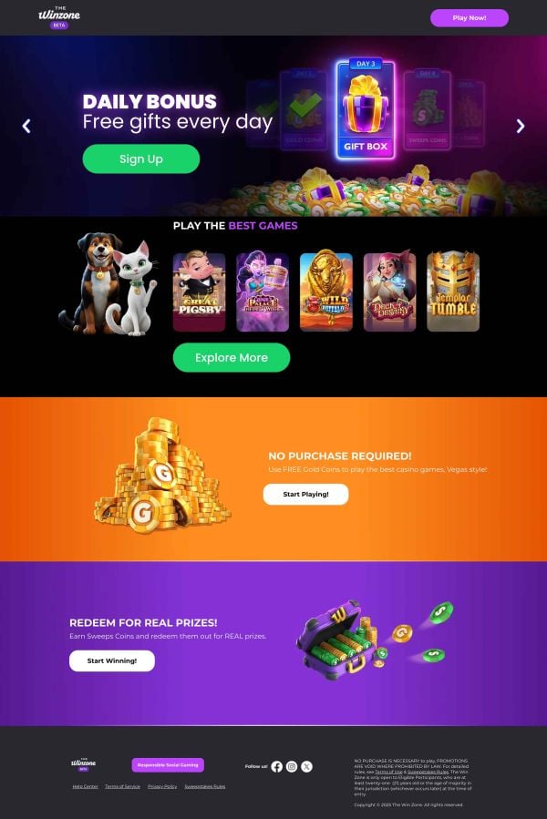 The Win Zone Casino gives you free-to-play access to enjoy a wide variety of social casino games. They offer generous Sweeps Coins rewards and mobile-friendly gameplay. You can try the best casino games slots with no purchase needed and the chance to redeem Sweeps Coins for real prizes!