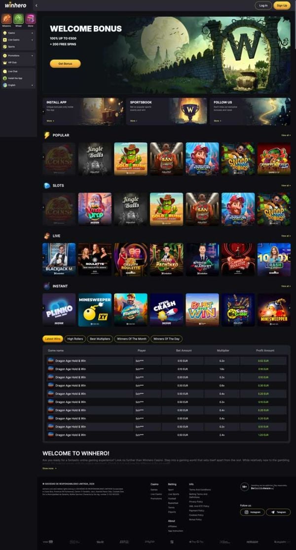 You can sign up at Winhero Casino and claim a 100% welcome bonus of up to €500 + 200 free spins. You’ll be able to play the latest online slots, table games, live casino games and sports.