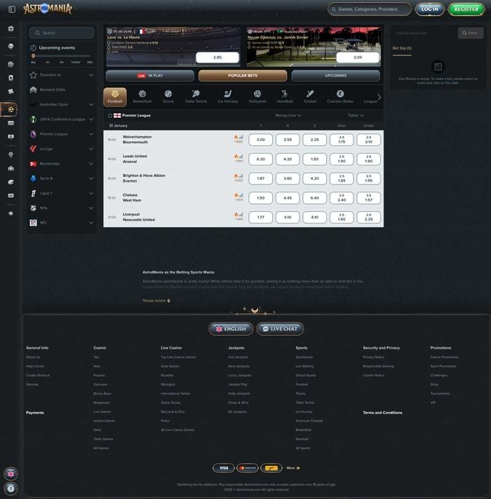 This is one of the newest sports betting sites, launched in 2025. Despite giving the impression that it’s an online casino, AstroMania is quite a comprehensive sportsbook, with lots of features to boot.