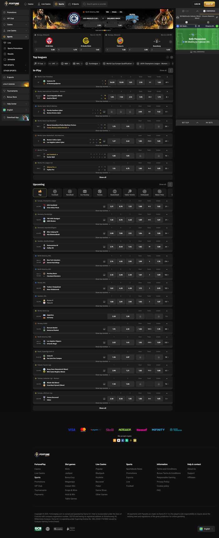 Fortune Play focuses heavily on football, which easily dominates the sportsbook, followed by solid coverage of tennis, basketball, ice hockey, table tennis, and handball. Volleyball is also available, though with a smaller selection.