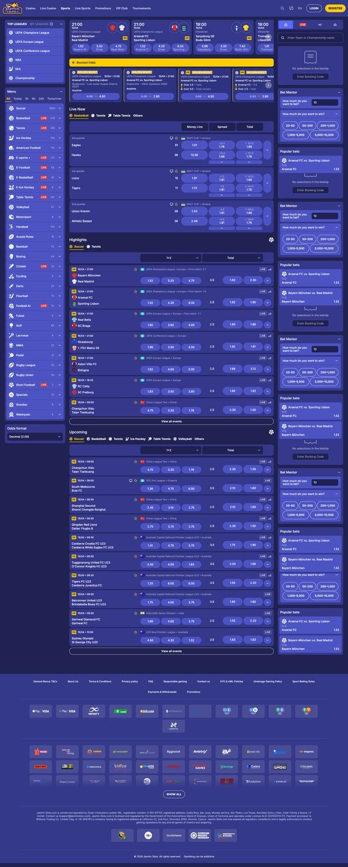 Bettors will find plenty of JasminSlots bonus offers available. These include midweek and weekend reload bonuses, acca boosts, bore draw, and 3+1 free bet bonuses.