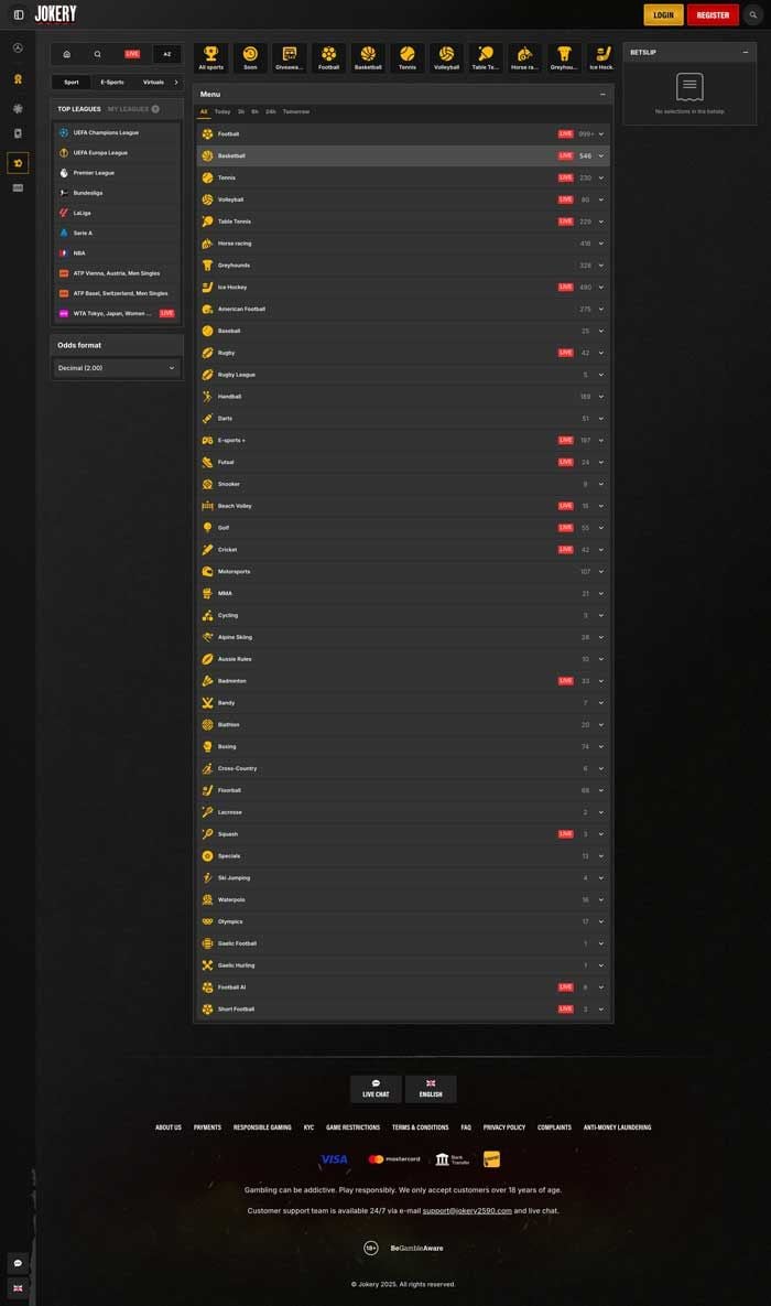 Jokery offers around 40 sports to bet on, so there is plenty to choose from regardless of your betting preferences. Football is, of course, the most popular option, as is the case with all international sports betting sites.