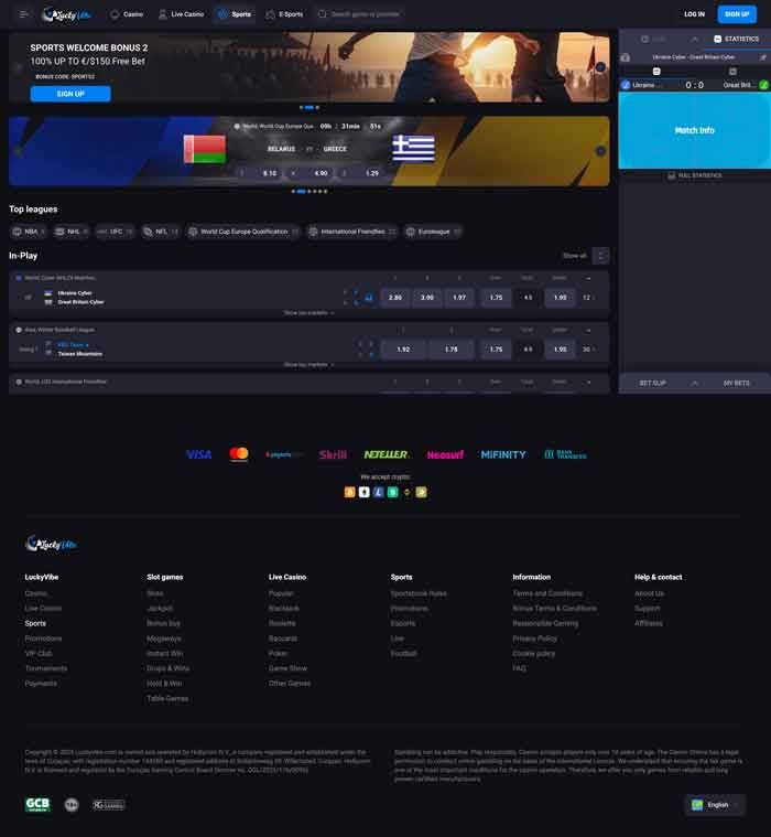 Lucky Vibe is a sports betting site and online casino, owned by Hollycorn N.V. Casinos, a company licensed by the Curaçao Gaming Control Board. It is a license that allows operations in many markets, but also restricts the operator from some key markets.