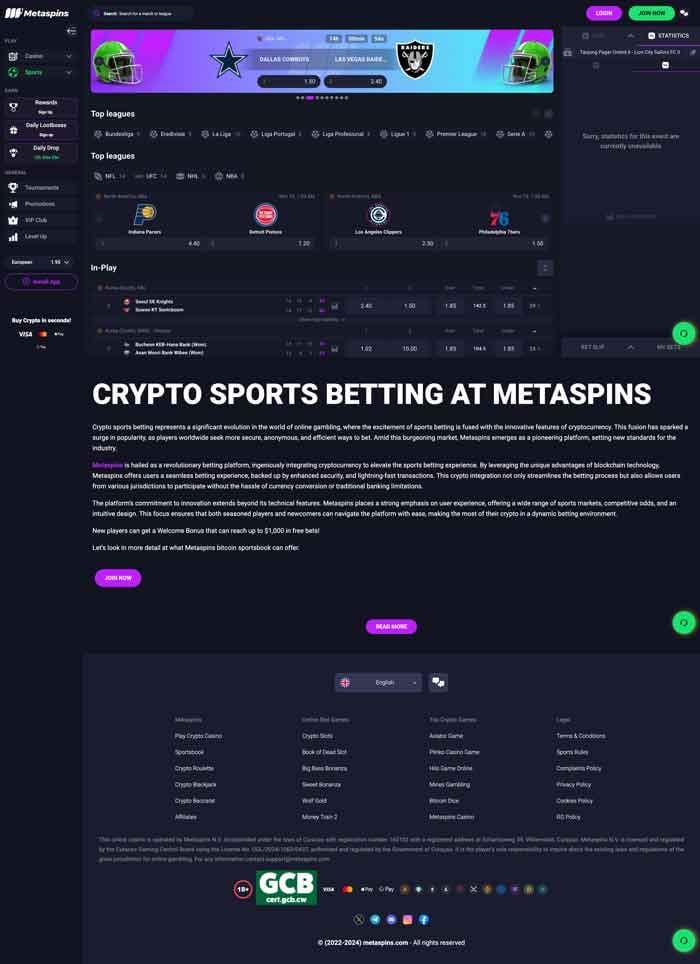 Metaspins, as the name probably implies, is all about the crypto world. Now, although it's mainly a casino site, it houses a robust sports betting section with plenty of sports betting action and promotions.