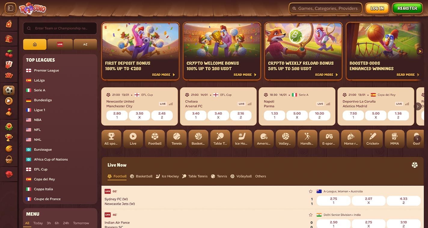 - In-play betting: The Roostino in-play betting section covers an extensive range of live-sports from around the world, with the sportsbook regularly offering in-play boosts on sports like football.