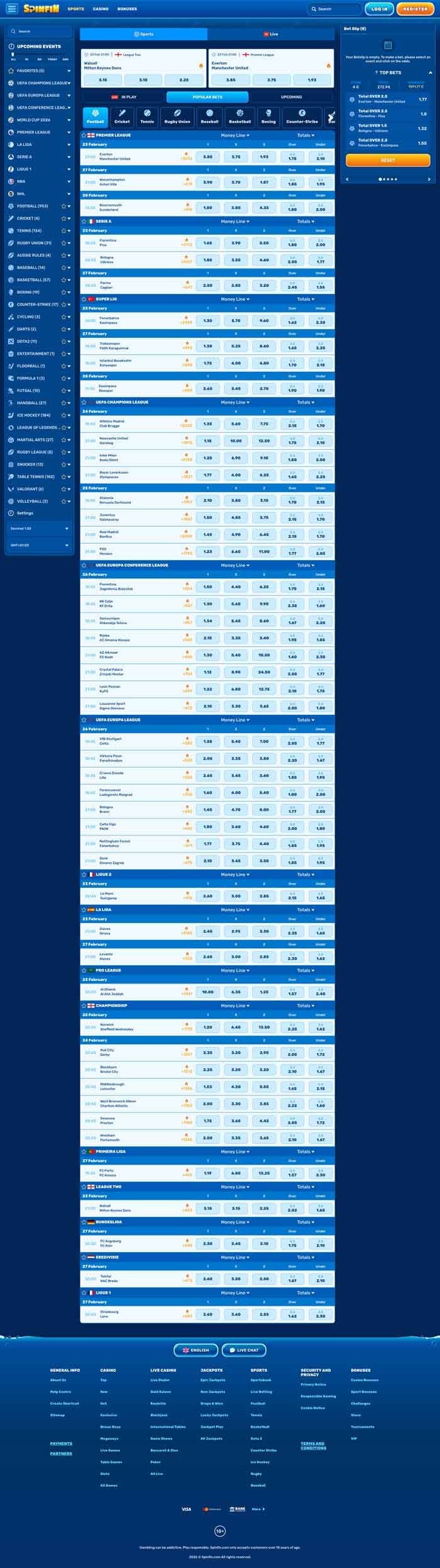 Since football is massively popular all around the world, it is also the most popular sport at Spinfin, and we can see that from the most popular leagues and competitions on the website and the number of available football markets.