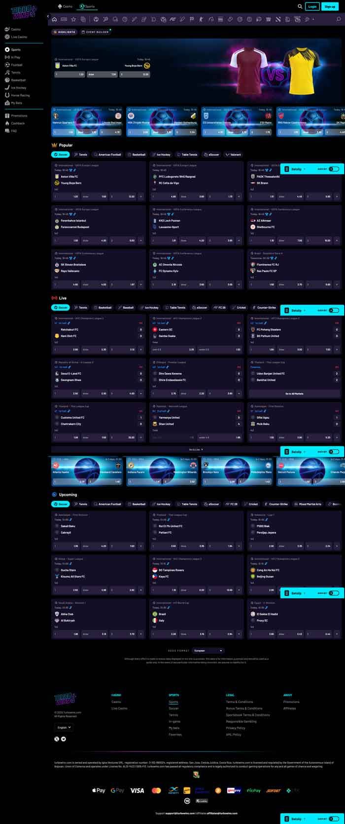 Turbo Wins features around 30 sports and other options to bet on, including esports, special markets and politics. The most popular sport to bet on is football, just like in every other international-facing sportsbook.