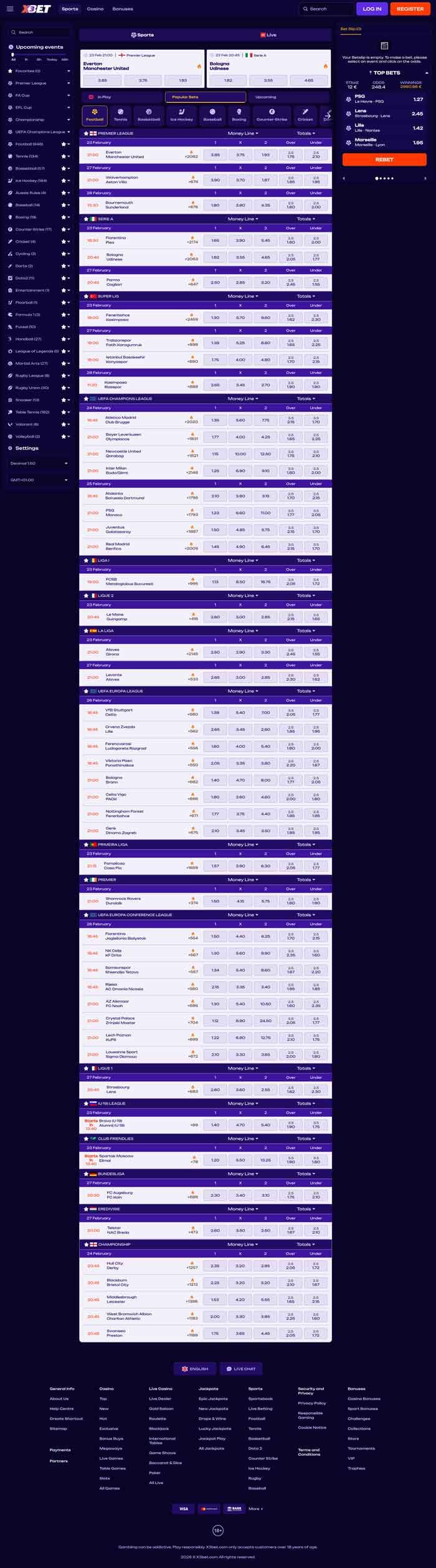 Among nearly 30 sports you can bet on, X3Bet clearly puts the most emphasis on the crowd pleasers. That is football, tennis, basketball, and ice hockey. The bookie highlights several big ongoing sporting events in the sportsbook, and you can clearly see the number of available events you can bet on within each category.